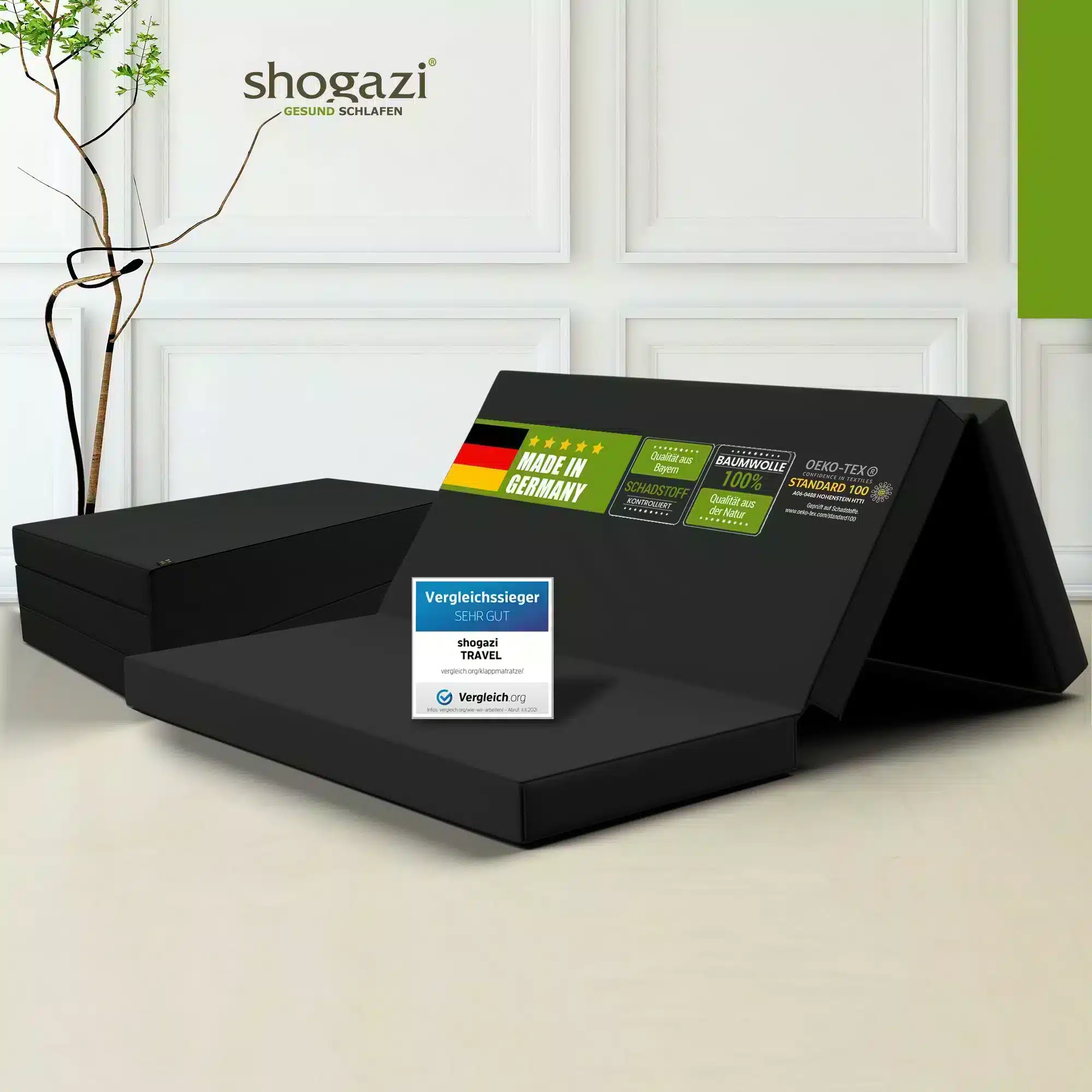 Wer auf Hochwertigkeit und ökologische Ansprüche Wert legt, ist bei der shogazi ® Manufaktur genau richtig. Die Klappmatratzen sind auf Schadstoffe nach OEKO-TEX® Standard 100 geprüft. Der Matratzenbezug besteht zu 100% aus Baumwolle und ist erhältlich in den Farben anthrazit, blau und weinrot. Der Bezug ist sehr hautfreundlich, reißfest, hitzebeständig, langlebig und pflegeleicht.