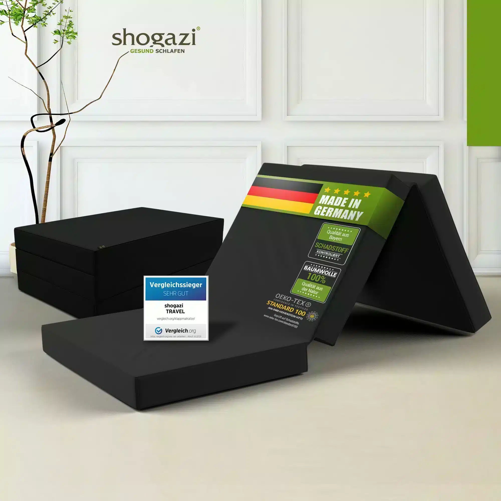Wer auf Hochwertigkeit und ökologische Ansprüche Wert legt, ist bei der shogazi ® Manufaktur genau richtig. Die Klappmatratzen sind auf Schadstoffe nach OEKO-TEX® Standard 100 geprüft. Der Matratzenbezug besteht zu 100% aus Baumwolle und ist erhältlich in den Farben anthrazit, blau und rot. Der Bezug ist sehr hautfreundlich, reißfest, hitzebeständig, langlebig und pflegeleicht.