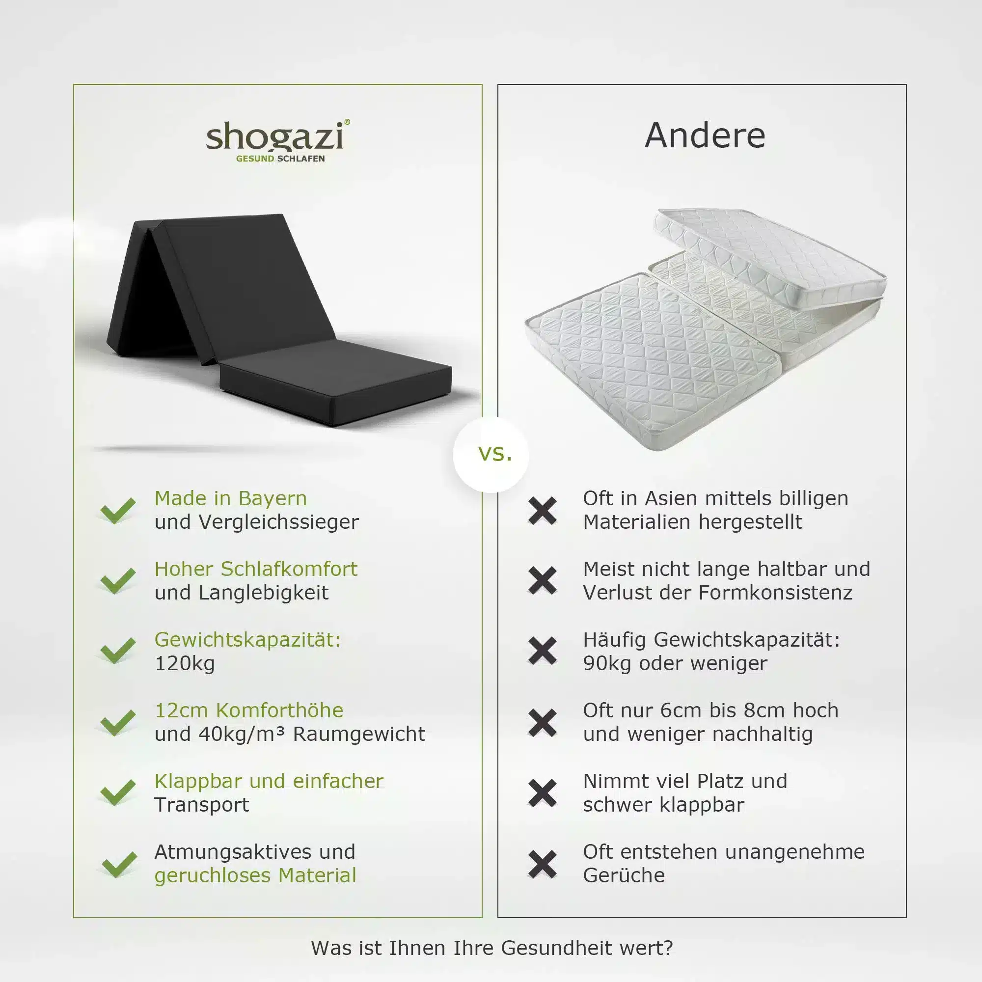 Schnelle Lieferung, super Service! Nach dem leichtsinnigen Kauf einer Billig-Matratze (nie wieder!) ist die Shogazi-Klapp-Matratze endlich die super Lösung zum Schlafen im Kinderzimmer neben dem Babybett! Danke!