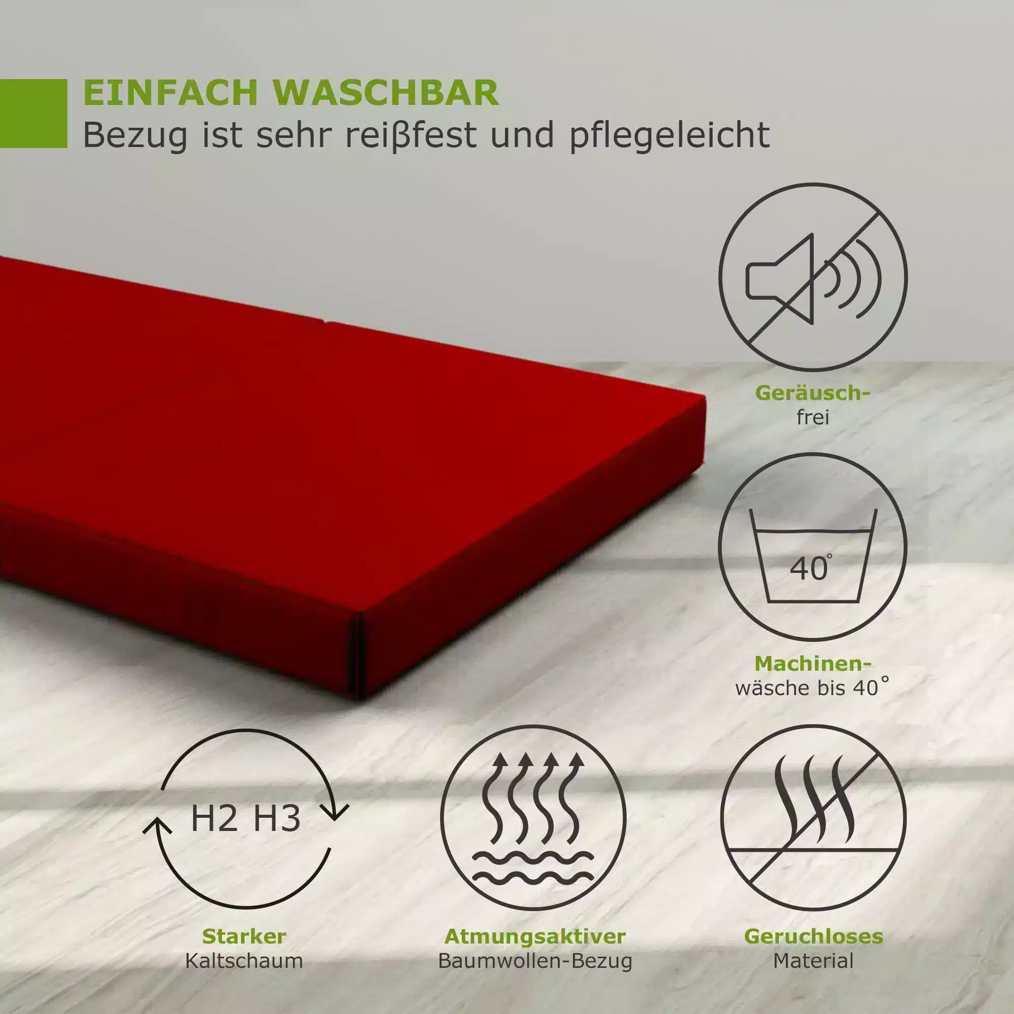 Mit abnehmbarem, waschbarem Bezug, Maschinenwäsche bis 40 Grad. Kompakte, verstaubare Größen  und großartigem Preis-Leistungsverhältnis. Diese Matratzen gibt es in der Trendfarbe anthrazit, einem warmen weinrot und in einem schönen königsblau; je nach Geschmack und Einrichtungspräferenzen.